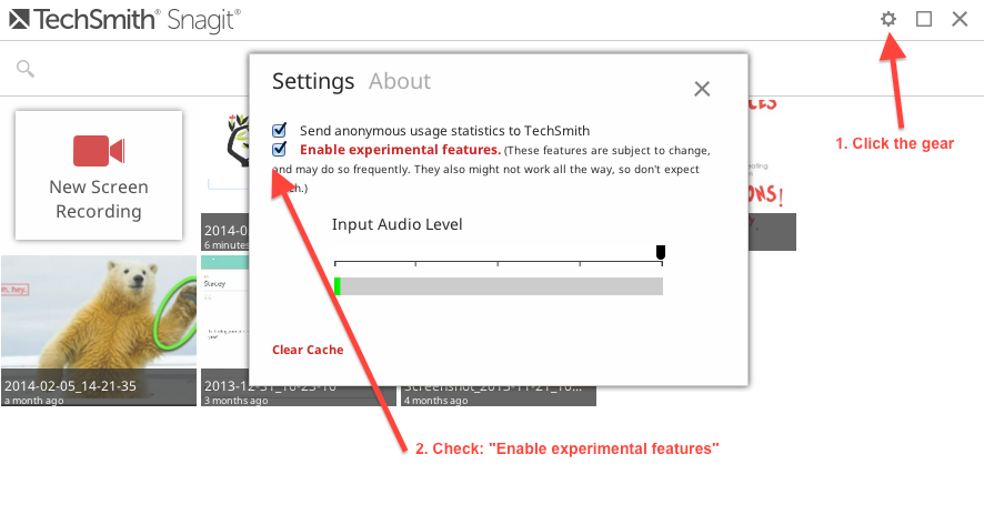 5. The screen below should pop up. Hit the gear icon and then check the “enable experimental features” box, as in the image below: