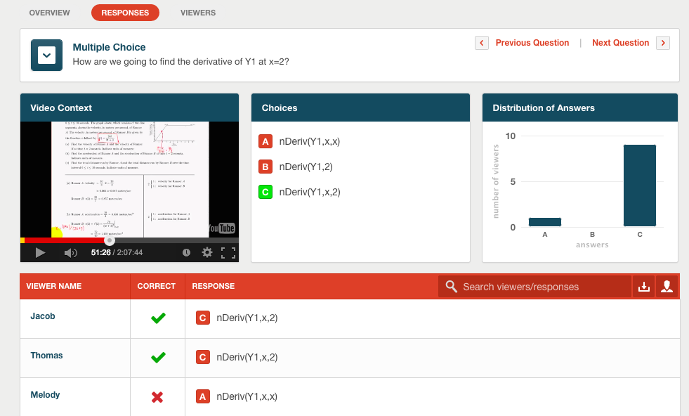 Sidetone: in the “responses” view, one thing that would be nice is to be able to sort the columns (i.e.: by correct/incorrect or by viewer name). You can sort alphabetically, by student, in the “viewers” view.