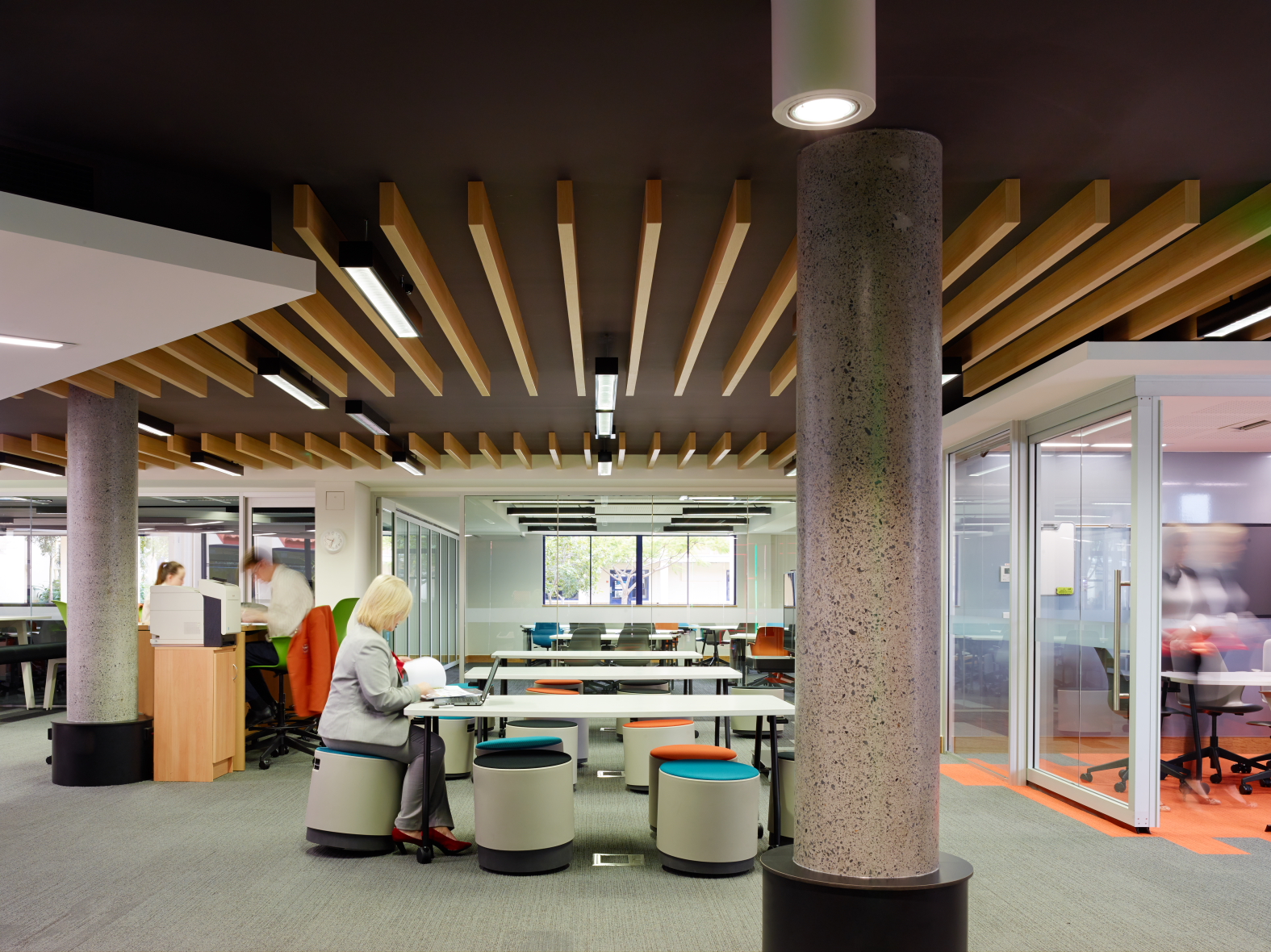 In the open space outside of the classrooms, there is a lot of similar furniture as I wrote about in the MOOC and math space. When I walked through, some students were creating a lab report comparing the quality of water in Yaun Creek, which is at the back of the school, with Coomera River. They were looking at things such as turbidity, oxygen content, biotic factors, etc. comparing the two bodies of water. Students had used Microsoft Excel to analyze some of the data and then were writing up their report in Microsoft Word. I was impressed with the careful attention to formatting including title page and table of contents. Again, because of the flexible learning spaces, some students were able to be receiving direct instruction while other students in the same class were able to work on a cumulative learning task in creating their report, in groups.