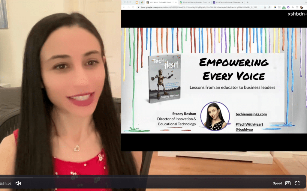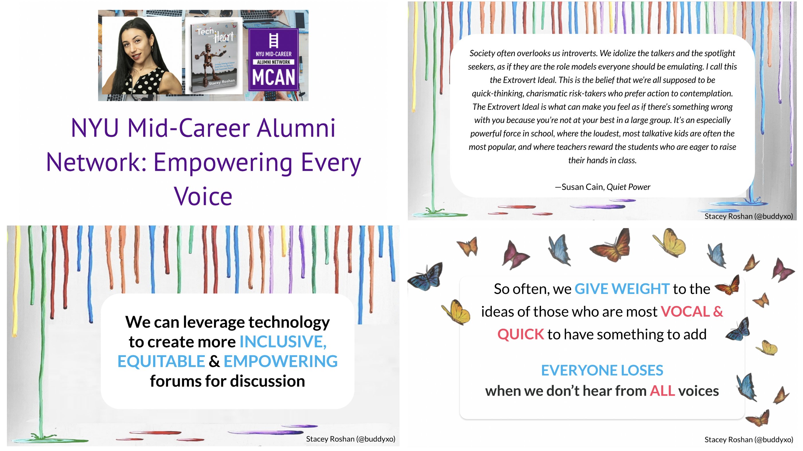 It was an honor to have a chance to lead a virtual talk offered through NYU’s Mid-Career Alumni Network. My session focused on leveraging simple technology tools to create more equitable and empowering discussions. I shared strategies for using edtech like Flip and Pear Deck to transform the traditional meeting culture to make the best use of face-to-face time, cultivate stronger relationships, and allow for creative freedom of thought. Only our imagination is holding us back from building more inclusive conversations representative of all ideas in the room.