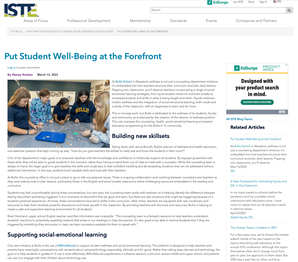 I’m grateful for the work Bullis School is doing to prioritize wellness, including integrating new programs like #WinAtSocial and a team of counselors who work closely with both teachers and students.