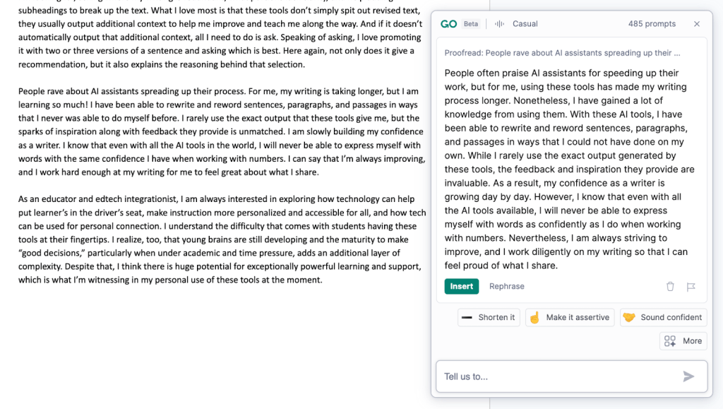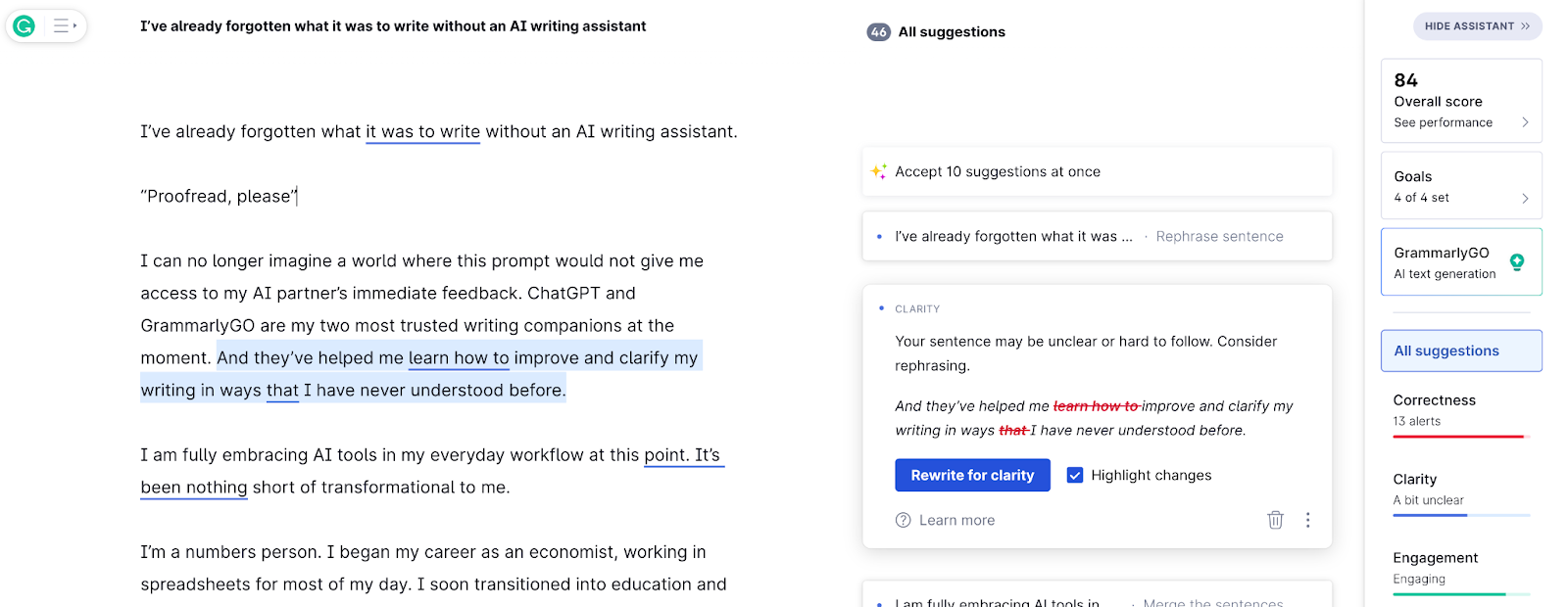I can no longer imagine a world where this prompt would not give me access to immediate feedback from my AI partner. ChatGPT, GrammarlyGO, and Wordtune have become my most trusted writing companions. They have helped me improve and clarify my writing in ways I never understood before.