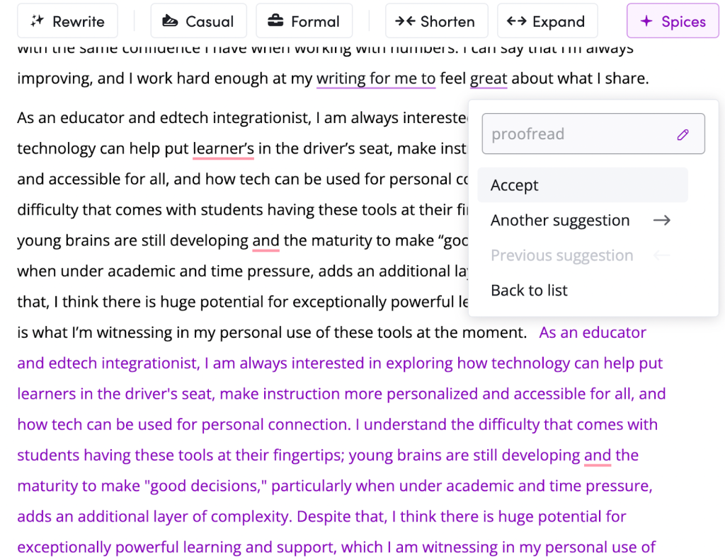 Wordtune Spices offers the most subtle suggestions to my writing but has incredibly powerful tools to generate multiple suggestions to refine sentences with one tap. Spices offer a number of built-in prompts to help with idea generation and to help focus in on your desired message. I most often use Wordtune for social media posts and sentence revision. Learn more in my walkthrough of Wordtune.